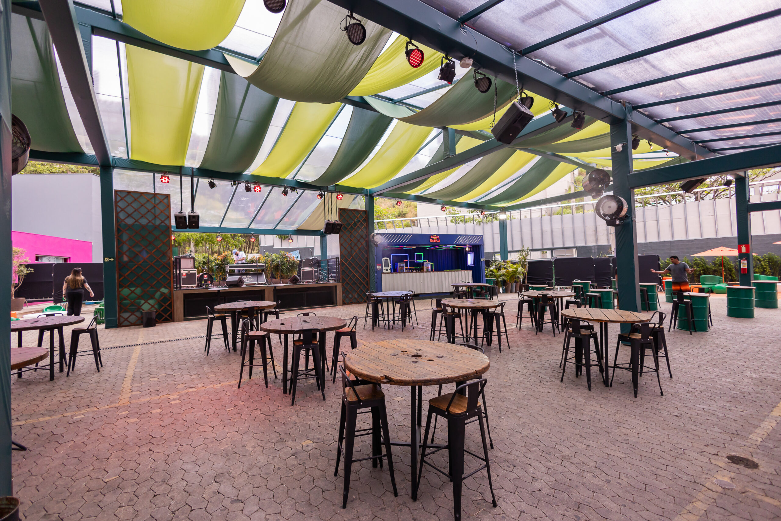 Ambiente externo, nosso jardim é um espaço arejado, acolhedor e conta com estrutura independente do Clube, incluindo palco, bares, banheiros e recepção.